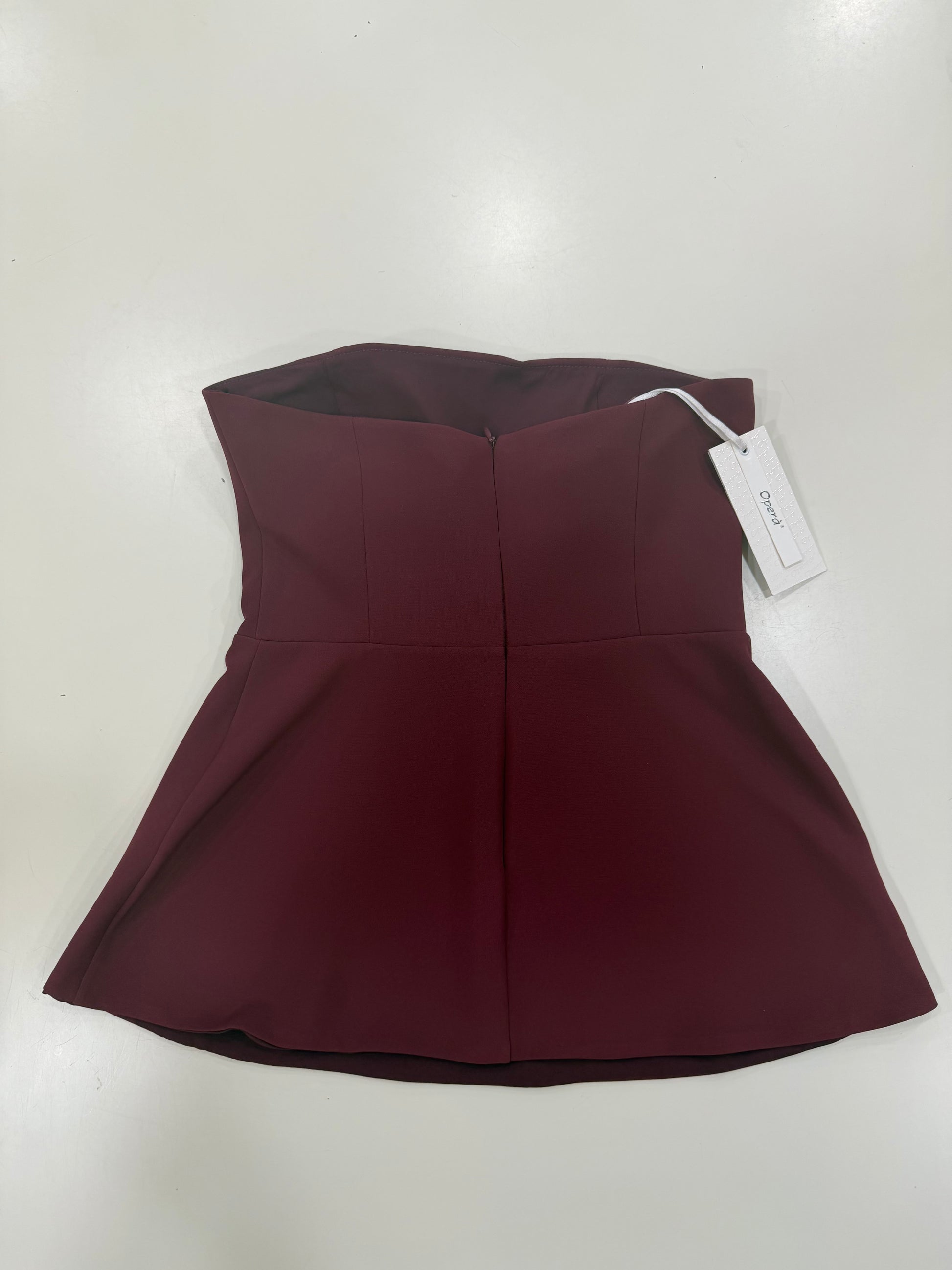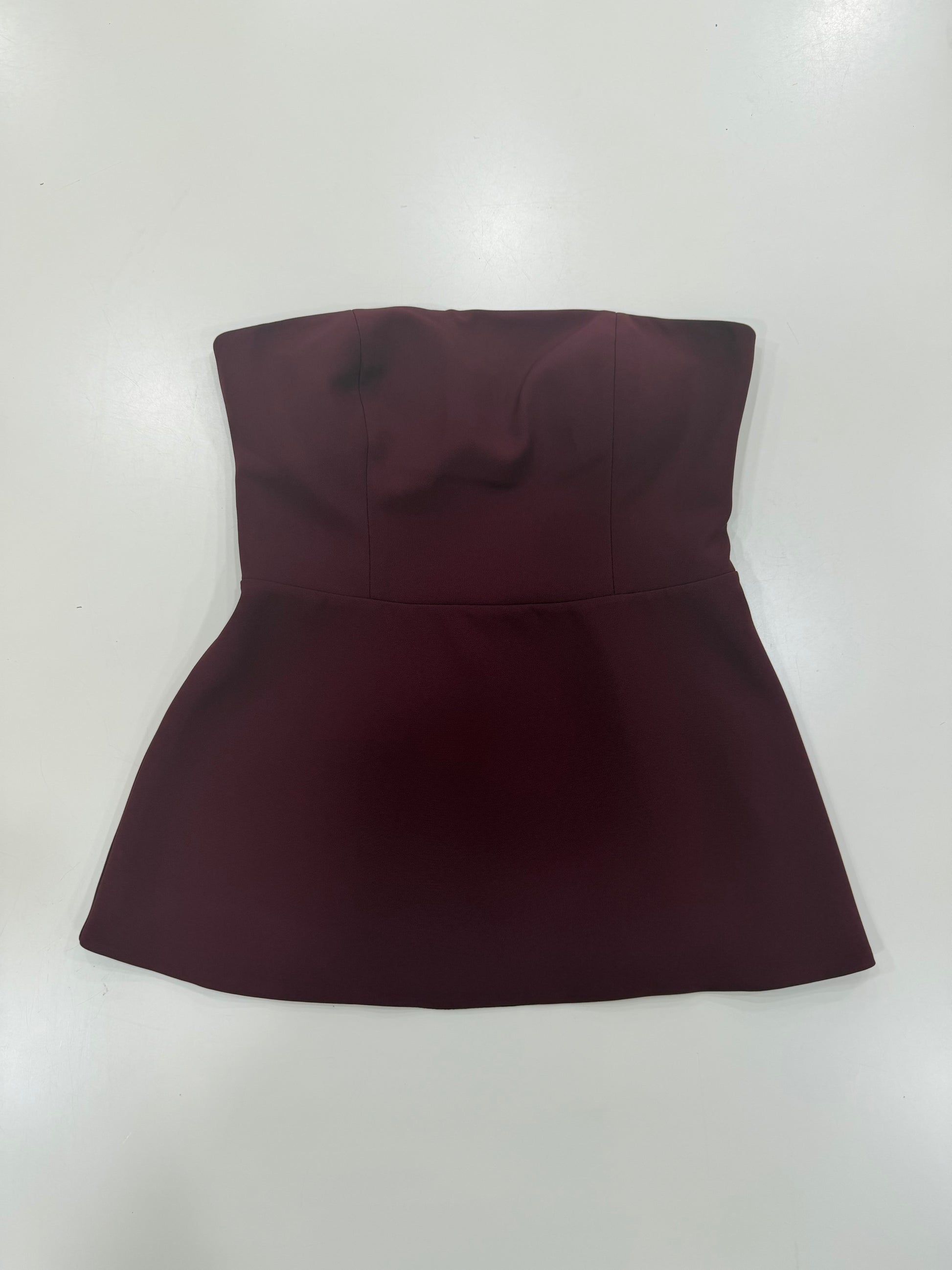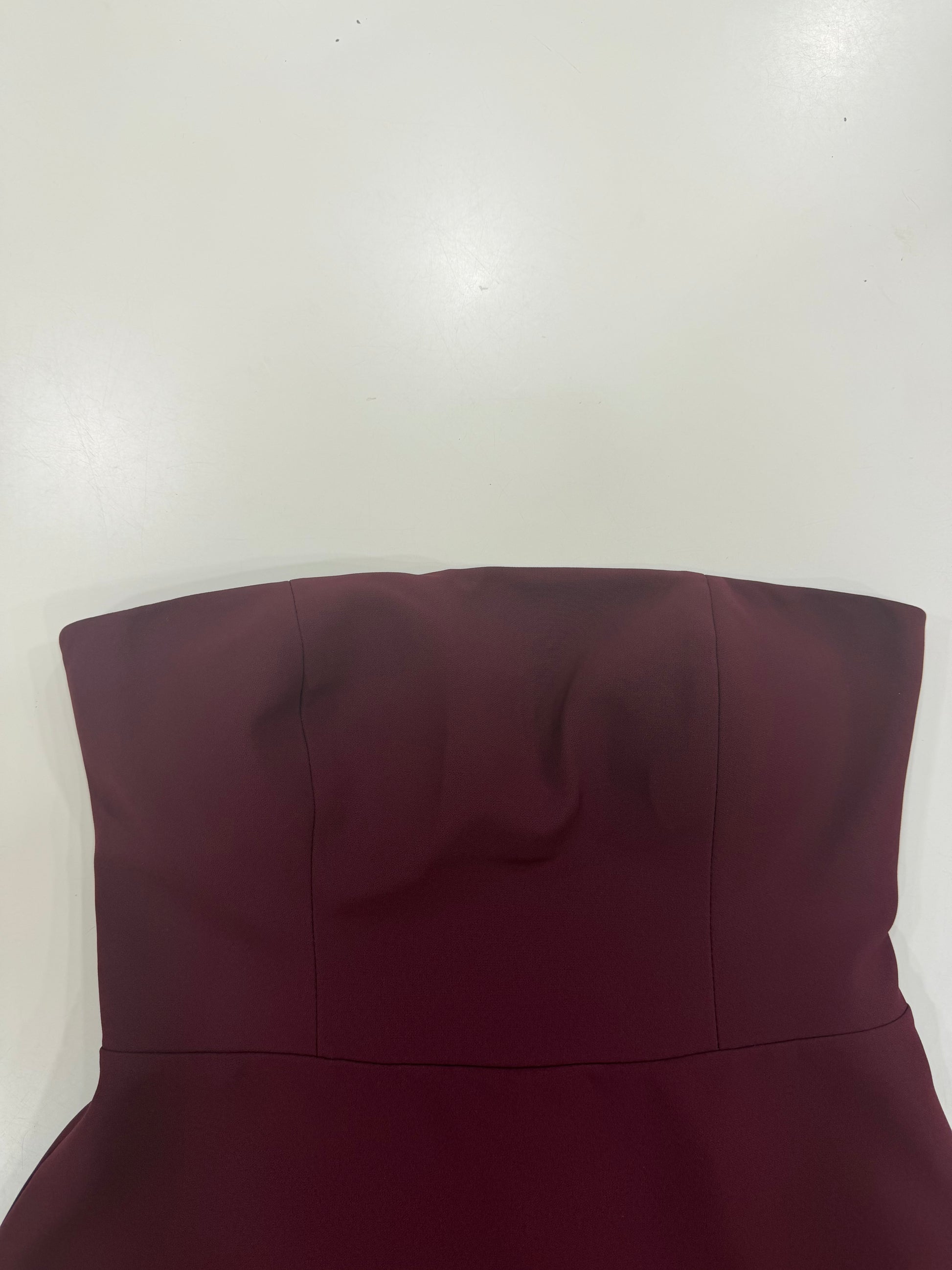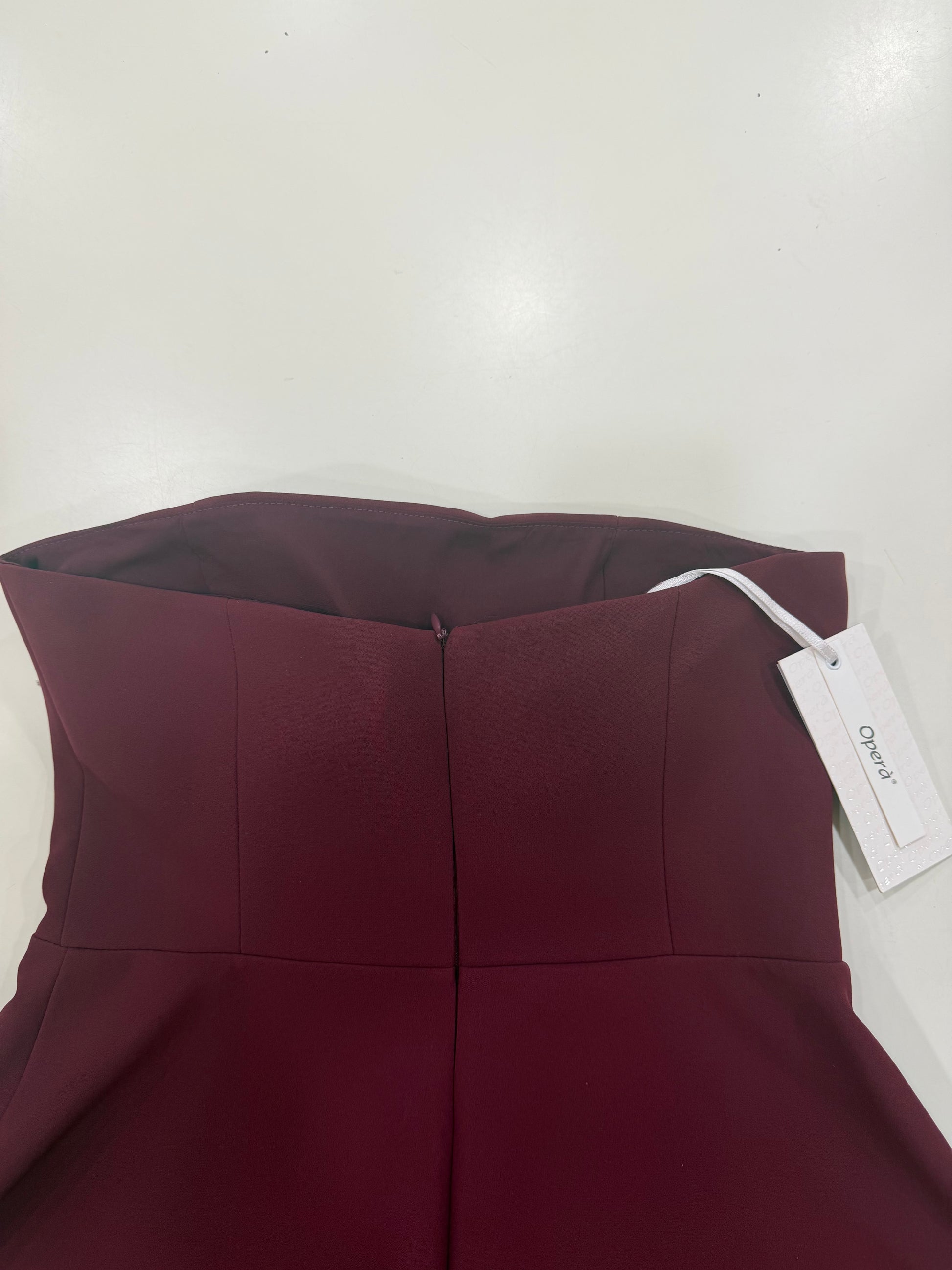 Un completo elegante e moderno in tonalità bordeaux, composto da top senza spalline con linea svasata e cintura decorativa in vita, abbinato a pantaloni fluidi che slanciano la figura.