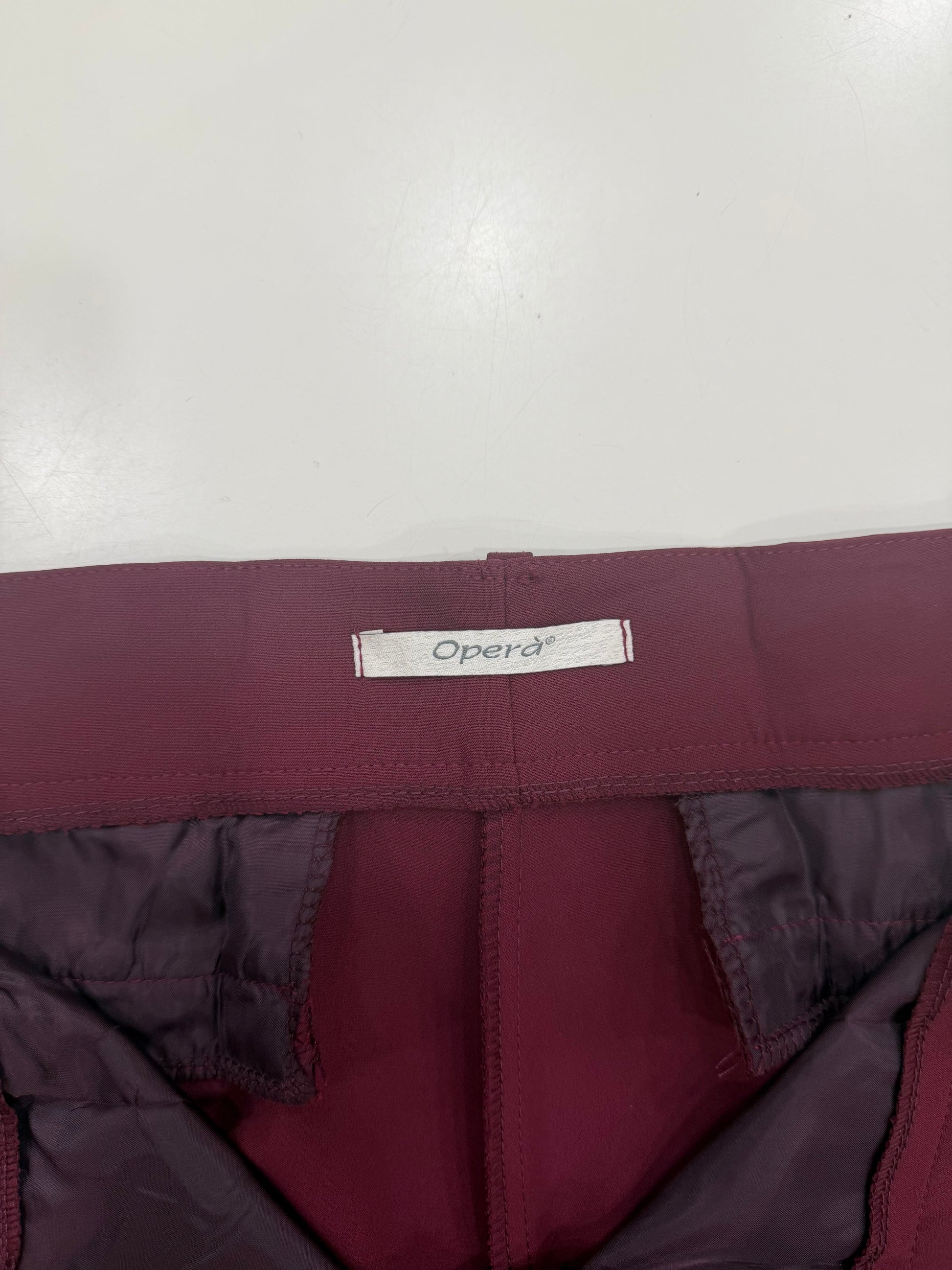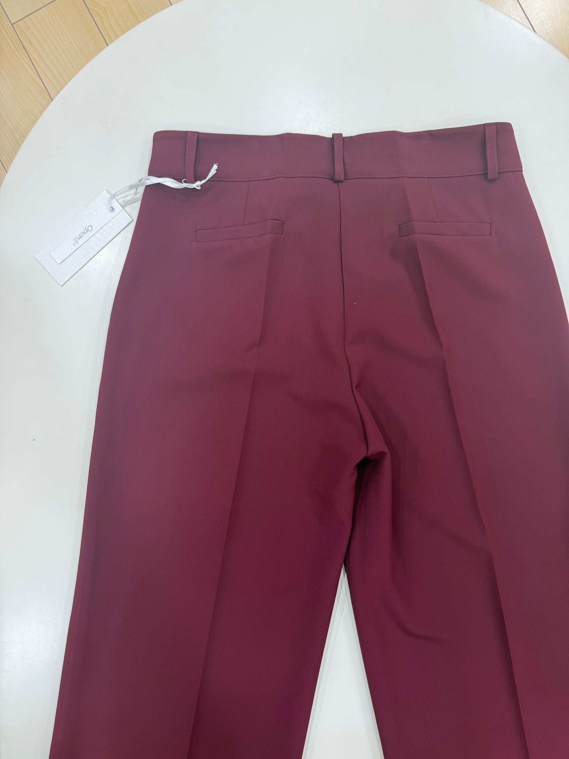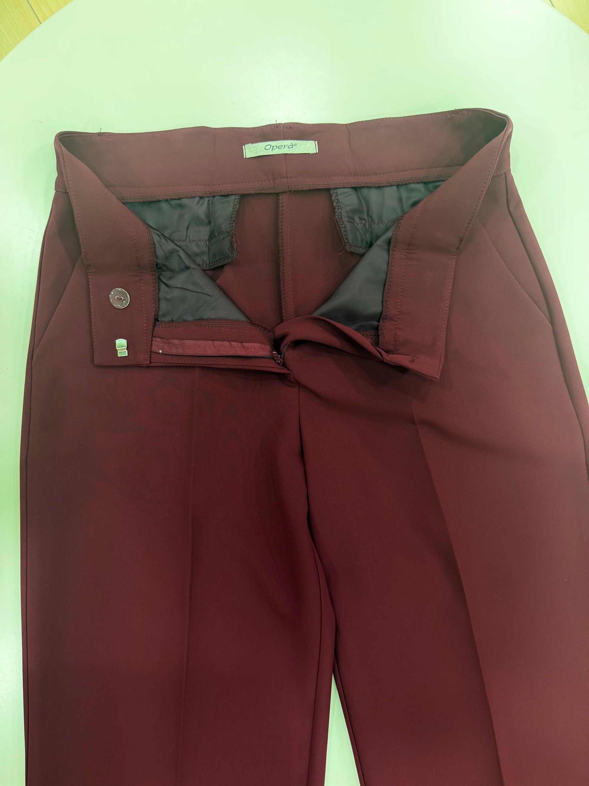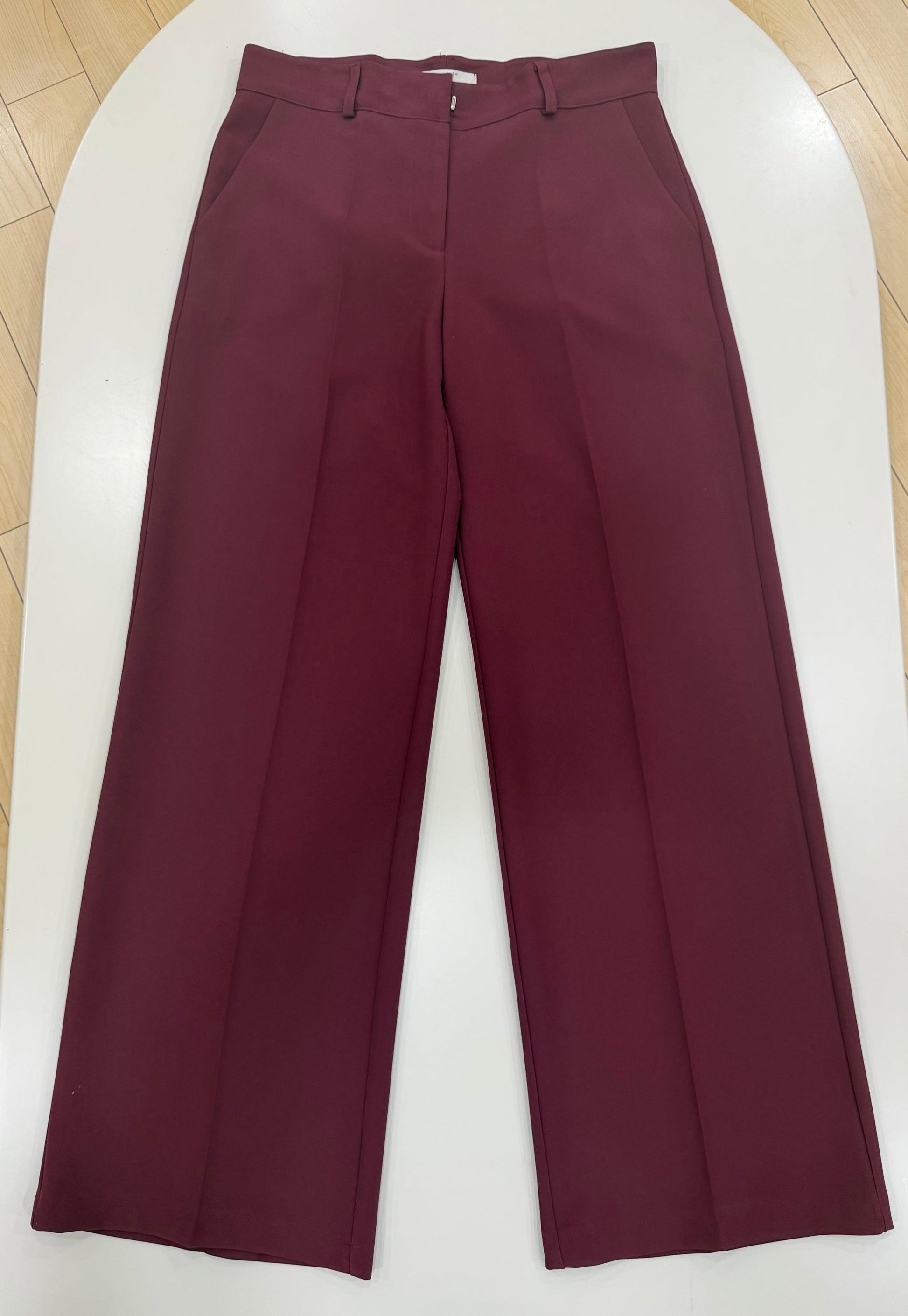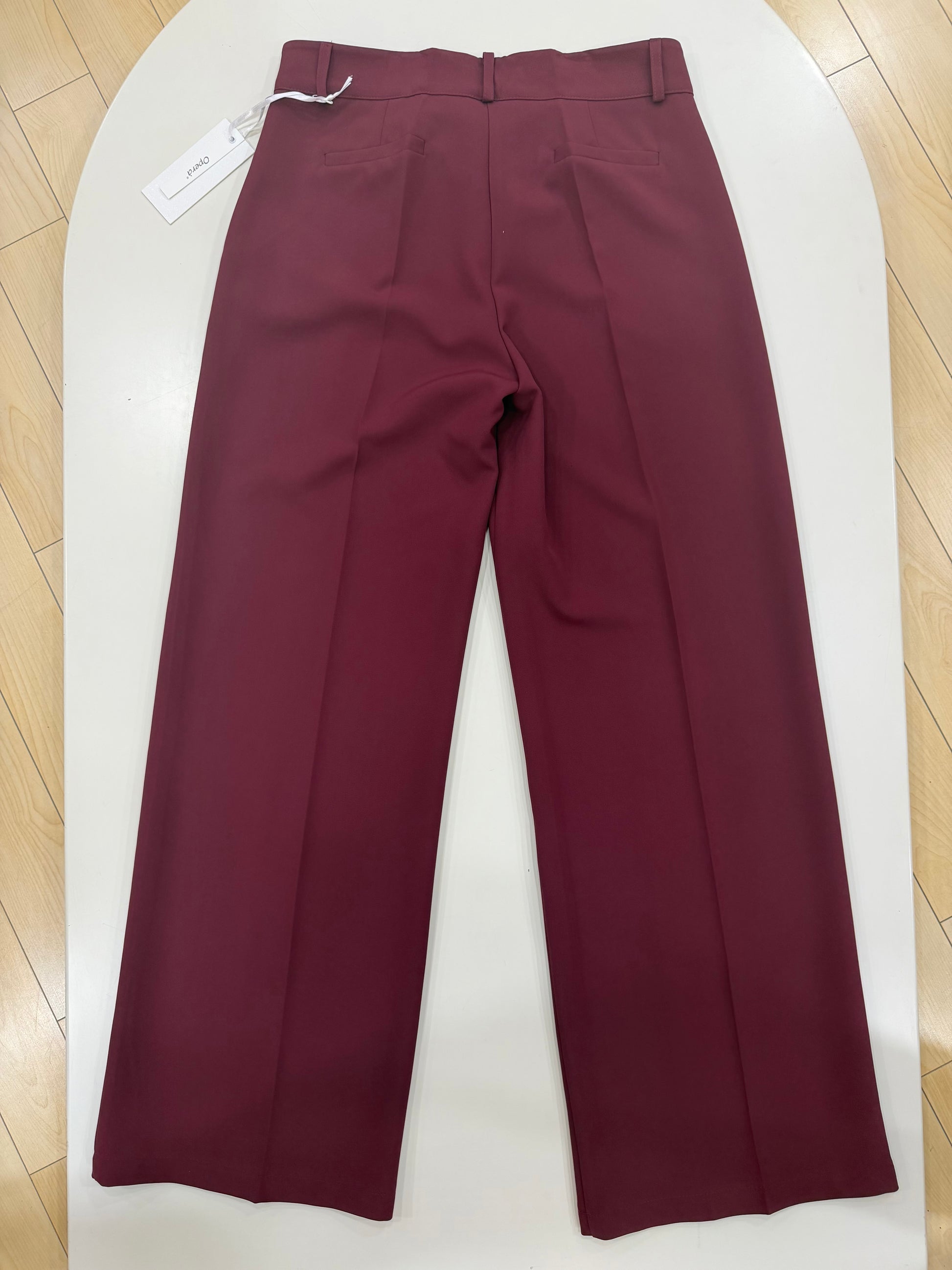Un completo elegante e moderno in tonalità bordeaux, composto da top senza spalline con linea svasata e cintura decorativa in vita, abbinato a pantaloni fluidi che slanciano la figura.